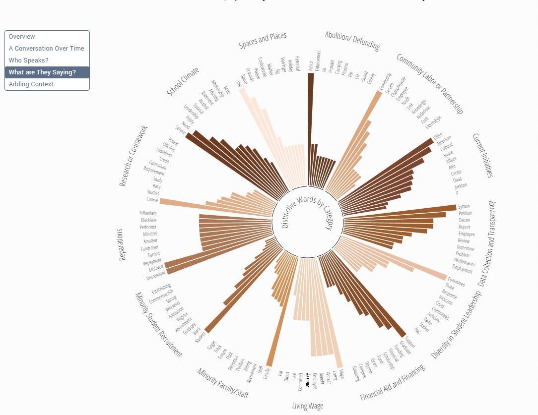 Who has time during important foundational course, meant for acquiring wisdom of “the best that has been thought and said.,” to color-code the number of times a word is used in a particular department seems especially bizarre. Why would it be important to correlate the findings in shades of black, brown or tan? Is anyone watching out for our tax dollars? Does the Board of Visitors know about this? Do Department Heads find this a good use of funds? Is this a strategic objective, and if so, who is behind it? Deconstruction philosophers, Michel Foucault or Jacques Derrida?